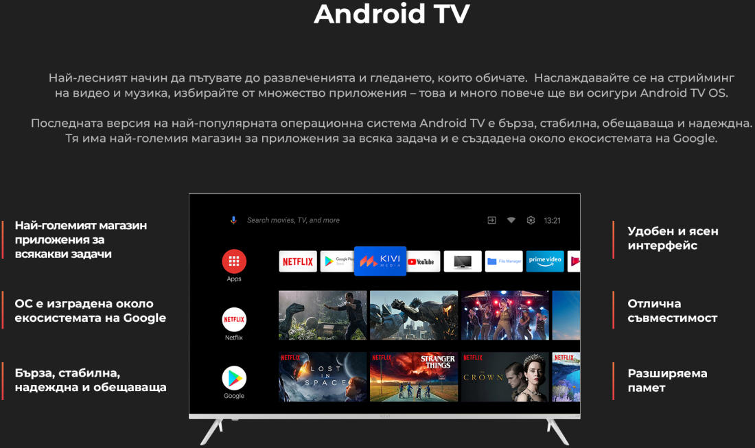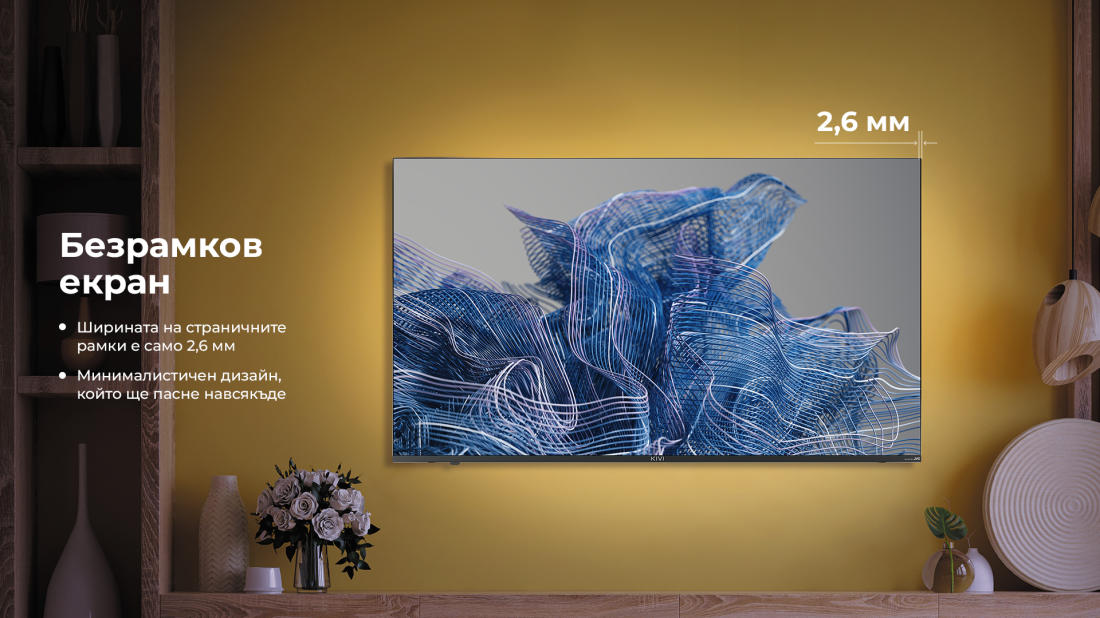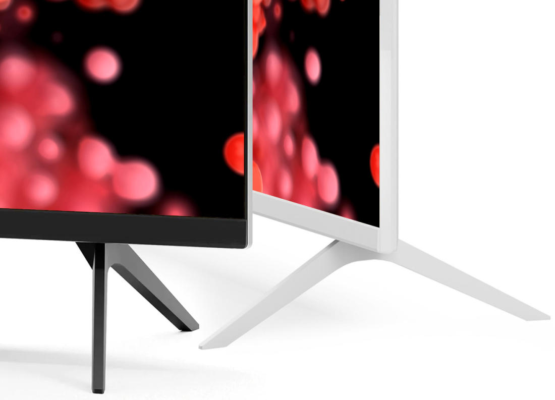 Елегантните метални стойки подчертават минимализма на дизайна и здраво задържат корпус. Телевизорите KIVI Smart TV ще допълнят хармонично всяка среда и ще се превърнат в стилен акцент в интериора.