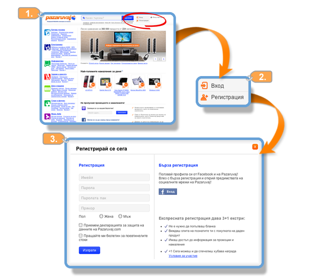 Ако нямаш още Facebook профил, просто кликни на бутона "Регистрация" по-долу, задай имейл адрес, парола и ник, и ще се регистрираш директно в Пазарувай.ком.